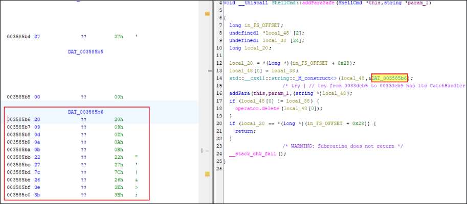 • ShellCmd::addParaSafe: 시스템 명령어의 인자값을 안전하게 추가하기 위해 설계된 보안 함수입니다. 입력값 내의 위험한 문자를 검증하고 이스케이프하는 역할을 수행합니다. 하지만 이번 분석을 통해 특정 메타문자에 대한 필터링 미비점이 확인되었습니다.